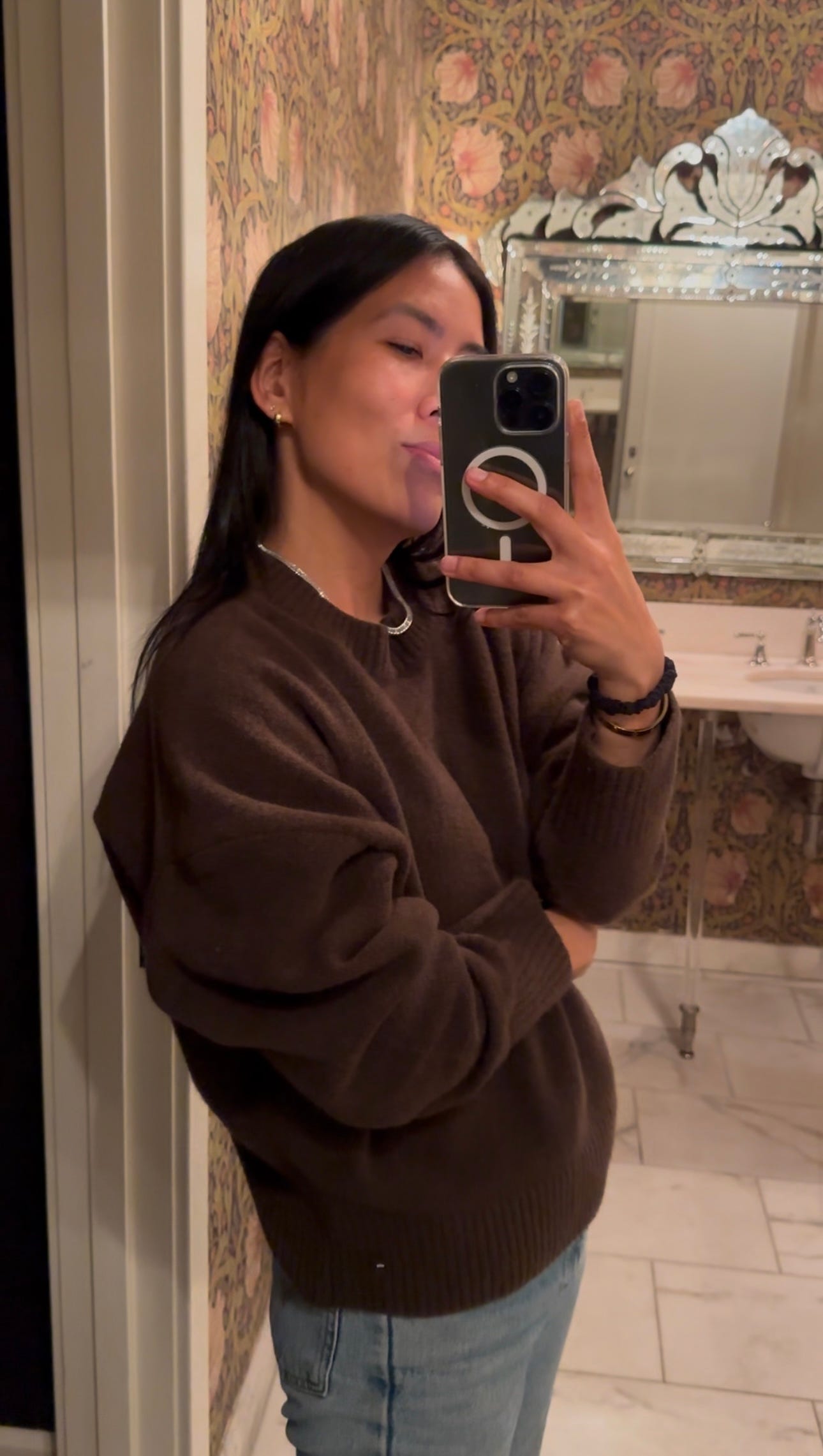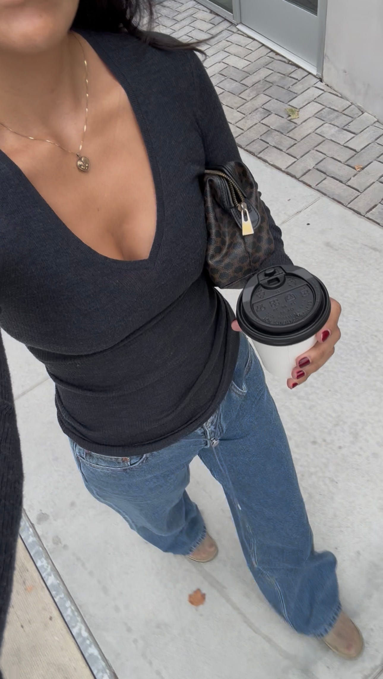This paper weight, super soft sweater. My favorite layering piece right now. Worn with these wide leg jeans that are so soft and don’t really feel like jeans. Vintage Celine bag, from The Vintage Marche. Lili has the best eye for the goods and it looks like she’s got one of these bags left right now (but she sources and puts up new ones every couple of weeks).