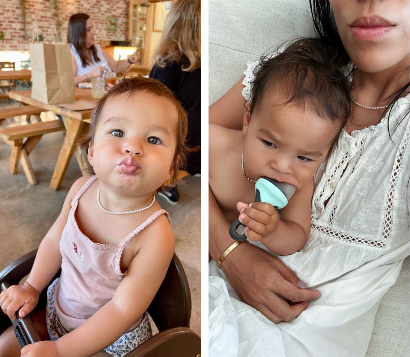This is probably my most asked about item: Piper’s pearl necklace. She’s had a few versions of this necklace, including the pricier Beatrice Valenzuela one and the not-pricey-at-all Etsy one. I love that the BV one is strung on silk and has the gold ball clasp, but I like that the Etsy pearls are a little bigger. Also the Etsy one makes a great gift for her friends! I get Piper the 12” length and I have a matching 16” length, but there’s lots of length options.