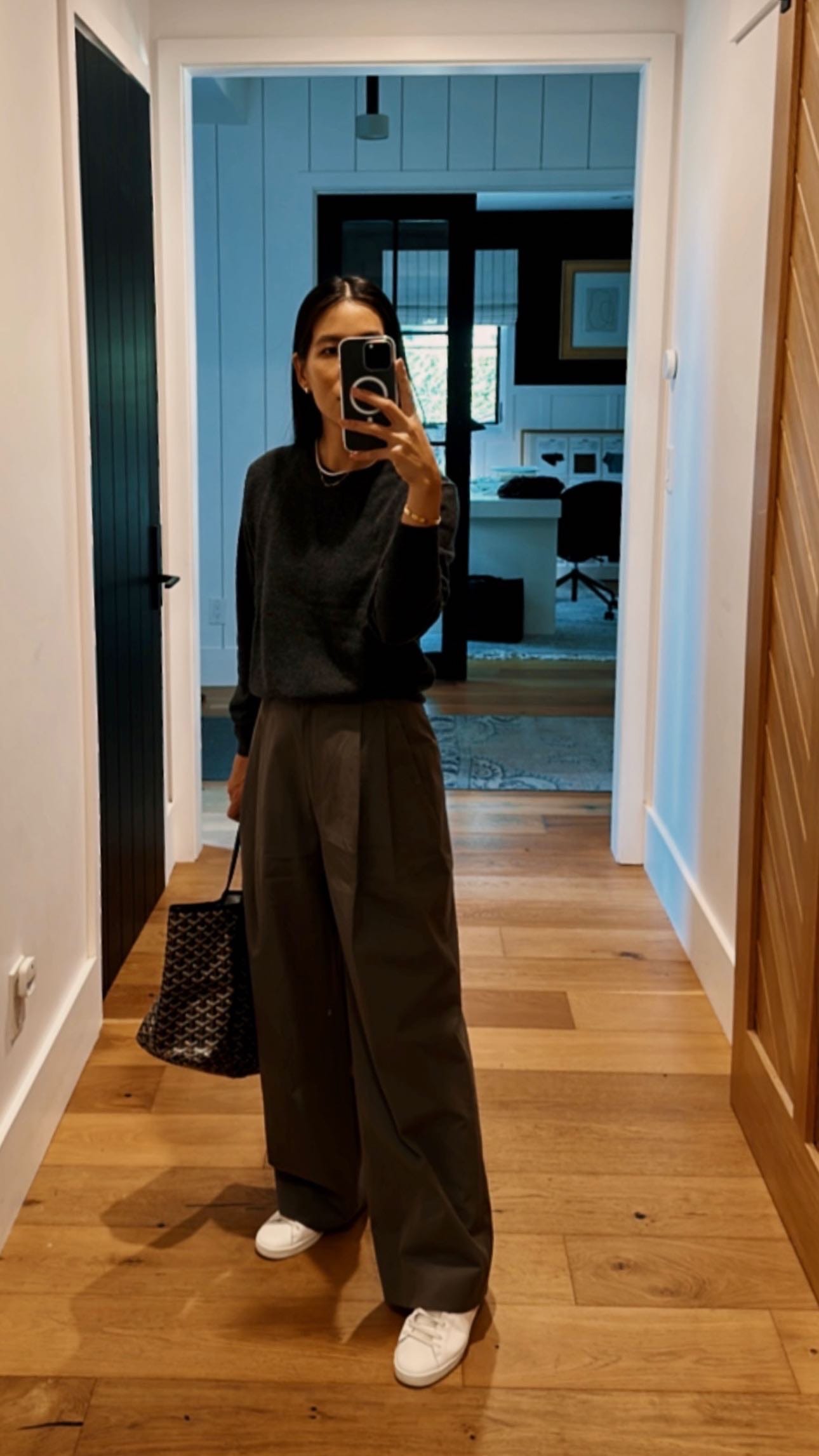 The Frankie Shop pants below. I love them so much, and if you’re thinking about it, just get them — they remind me of The Row but for a fraction of the price. I take an XS and I would say they run just a smidge large but would still recommend taking your normal size. The Olive color I’m wearing is almost sold out but the Camel color has a few more sizes left and I’m thinking about grabbing. You will have to hem them unless you’re 5’8 or up.